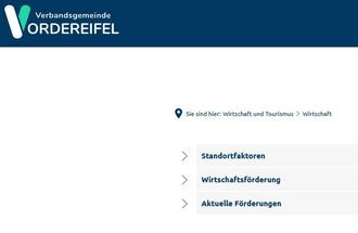 Die Verbandsgemeinde Vordereifel schafft Klarheit im Förderdschungel: Ab sofort finden Unternehmen auf der neu gestalteten Homepage der Verbandsgemeinde unter der Rubrik „Wirtschaftsförderung“ einen umfassenden Überblick über Fördermöglichkeiten. Ziel ist es, Betrieben den Zugang zu wichtigen Informationen über Zuschüsse und Förderprogramme von EU, Bund, Land und Kommunen zu erleichtern.