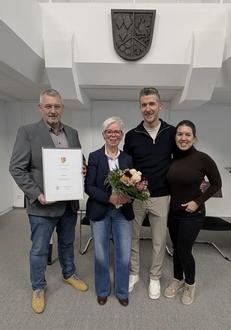 (v.l.n.r.): Der Erste Beigeordnete Christoph Kicherer händigt Waltraud Stenz im Beisein ihres Sohnes Sven und dessen Frau Leila die Dankurkunde der Verbandsgemeinde Vordereifel für die geleisteten Dienste aus.