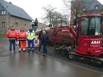 Bürgermeister Alfred Schomisch nutzte den turnusmäßigen Baustellentermin um sich in Reudelsterz bei Ortsbürgermeister Thomas Stolz und Vertretern der bauausführenden Firma ARAZ GmbH & Co. KG, der SPIE sowie der Westnetz GmbH über den Fortgang der Arbeiten für den Glasfaserausbau und die Erdverkabelung der Stromleitungen zu informieren