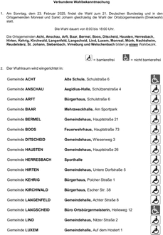 In den Wahlbenachrichtigungen, die den Wahlberechtigten in der Zeit vom 27. Januar 2025 bis 2. Februar 2025 übersandt worden sind, sind der Wahlbezirk und der Wahlraum angegeben, in dem die/der Wahlberechtigte zu wählen hat.