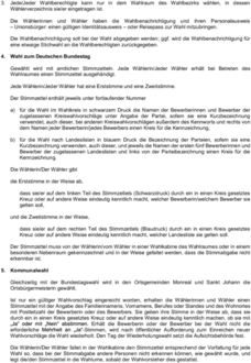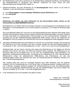 Die Wählerinnen und Wähler haben die wichtigen Hinweise und den Wegweiser für die Briefwahl auf den Merkblättern zur Bundestagswahl und zur Kommunalwahl zu beachten, um im Wege der Briefwahl gültig zu wählen.