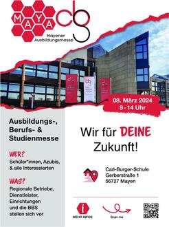 Mit MAYA - der zweiten Mayener Ausbildungs-, Berufs- und Studienmesse an der Berufsbildenden Schule Mayen - erhalten junge Menschen am Freitag, 08. März 2024 von 9.00 bis 14.00 Uhr die perfekte Gelegenheit, sich über die zahlreichen Perspektiven in der Aus- und Weiterbildung sowie über Studienangebote zu informieren.