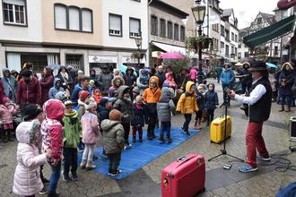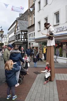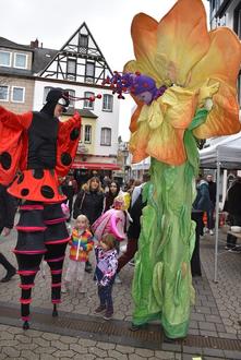 Jung und Alt schlenderten durch die Straßen der Innenstadt, in denen es neben den tollen frühlingshaften Malereien an vielen Orten etwas zu entdecken gab: Die Ladenbesitzer verteilten an die Kunden Frühjahrsblüher, Stelzenläufer riefen Staunen und ehrfürchtige Blicke hervor. Beim Kindermitmach-Konzert mit Edi Zauberfinger in der schönen Kulisse des Brückenviertels blieb keiner an seinem Platz. Auch das Ensemble der Burgfestspiele war mit der Mayener Kultfigur, dem „Zuckertoni“ mit von der Partie.