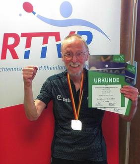 Selbst der amtierende Rheinlandmeister Georg Krämer (SSV Hattert) konnte im Finale den Sturm auf's oberste Treppchen des Zelluloid-Künstlers vom SV Eintracht Mendig nicht verhindern. Krämer wehrte sich, wie bereits beim Duell in der Vorrunde nach Kräften, doch der unorthodox agierende „Hexer“ von der Mosel, mit Tempo in den Bällen und Speed in den Beinen, agierte über weite Strecken zu abgebrüht, diktierte souverän die meisten Ballwechsel und siegte erneut mit 3:0 Sätzen. Mit einer Gesamtbilanz von 15:0 Sätzen im Einzel und 6:0 Sätzen im Doppel, zusammen mit Gerhard Blob (TTC Köllerbach), verteidigte der TT-Andersspieler eindrucksvoll seine beiden Titel in der Seniorenklasse Ü 75 aus dem Vorjahr und konnte somit das DM-Ticket für die Deutschen Tischtennis-Finals, Europas größtes Tischtennis-Event, an dem über 1000 Aktive um die nationalen Titel kämpfen, ausgetragen vom 6.-09.06.2025 in Erfurt, lösen.