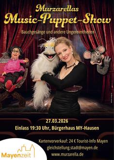 Mayen. Alle kennen Bauchredner, mit Murzarella alias Sabine Murza erleben Sie die Kunst des Bauchgesangs. Murzarella singt nicht nur selbst, sie lässt ihre Puppen singen und zwar im Bürgerhaus Mayen-Hausen am 27. März Einlass ist um 19:30 Uhr, Vorstellungsbeginn ist um 20 Uhr.