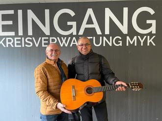 Dr. Paulo Pereira (rechts) übergab seine aus Indonesien stammende Gitarre als Spende für die Kreismusikschule MYK an Ernst Einig, Mitglied im Verwaltungsausschuss des MYK-Kulturforums.