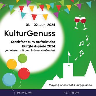 Am Samstag, 1. Juni wird das Fest mit einem gemeinsamen Startschuss um 10 Uhr auf dem Marktplatz eröffnet. Auf der Bühne am Marktplatz und in der Brückenstraße finden über den Tag verteilt verschiedene Programmpunkte aus den Bereichen Musik und Theater statt. Die Schauspieler*innen der Burgfestspiele präsentieren Ausschnitte aus dem Programm und Highlights aus dem persönlichen Repertoire. Am Abend spielt dann die Band „Straight and dry“ bekannte Songs aus Rock, Country und Blues.