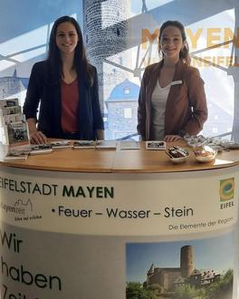 Büroleiterin Jasmin Alter (links) und Personalentwicklerin Anne Schomisch (rechts) an einem Stand der Stadtverwaltung Mayen