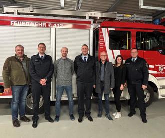 V.l.n.r.: Peter Kaliszan (Wehrführer Löscheinheit Kürrenberg), Stefan Stein (Wehrleiter), Ingo Berg (erneut gewählter stellv. Wehrführer Löscheinheit Kürrenberg), Sascha Reiff (stellv. Wehrleiter), Oberbürgermeister Dirk Meid, Christina Sabel (Bereichsleiterin 4.1), Thomas Velten (stellv. Wehrleiter)