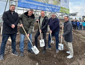 Der Spatenstich für „JAHN ELEVEN“ ist gemacht: Mendig bekommt in der Jahnstraße 24 barrierefreie Wohnungen und in direkter Nachbarschaft eine Tagespflegeeinrichtung (von links): Florian Bales, „Novarus Tagespflege“, Sascha Bräuer, „Bauberatung & Baubetreuung Sascha Bräuer“, Jörg Lempertz, Bürgermeister VG Mendig, Achim Grün, Stadtbürgermeister Mendig, und Jens Firmenich, Beigeordneter Landkreis Mayen-Koblenz.