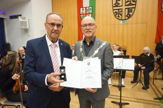 Dieter Winkel (links) und Oberbürgermeister Dirk Meid bei der Überreichung des Ehrenrings