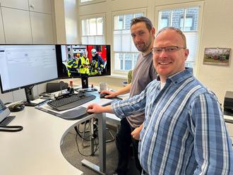 Christopher Wittig (vorne), Fachbereichsleiter Familien, Schulen, Ordnung und Soziales der VG-Verwaltung Mendig sowie Wehrführer der Freiwilligen Feuerwehr Mendig, und Florian Rieser, Feuerwehr-Sachbearbeiter der VG-Verwaltung Mendig, sind mit den neuen digitalen Möglichkeiten für die Freiwilligen Feuerwehren der VG Mendig sehr zufrieden.