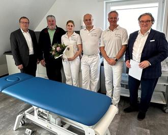 Zuwachs in der Orthopädischen Gemeinschaftspraxis Mendig: Übergabe des Bescheides über eine Förderung in Höhe von 15.000 Euro für Dr. Nadine Kron. Mit ihr freuen sich (von links): , Joachim Plitzko, Erster Beigeordneter VG Mendig, Achim Grün, Stadtbürgermeister Mendig, Dr. med Jochen Ritzenhoff, Facharzt für Orthopädie, Manuelle Medizin und Akupunktur, Oliver Gerber, Facharzt für Orthopädie und Orthopädische Rheumatologie, Manuelle Medizin und Akupunktur, und Jürgen Zinken, Wirtschaftsförderer VG Mendig.