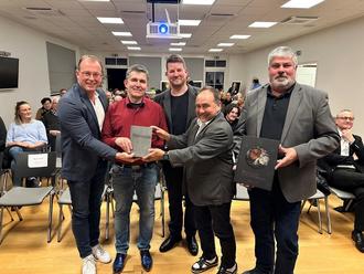 Das Buch-Projekt „Finsterlay“ wurde im Ratssaal der VG Mendig vorgestellt. Und als Erinnerungsgeschenk gab es „Finsterlay“ auch noch in Basalt (von links): Jörg Lempertz, Bürgermeister VG Mendig, Olaf Kaul, Marc Hillesheim, Alfred Schomisch, Bürgermeister VG Vordereifel, und Achim Grün, 1. Beigeordneter Stadt Mendig.
