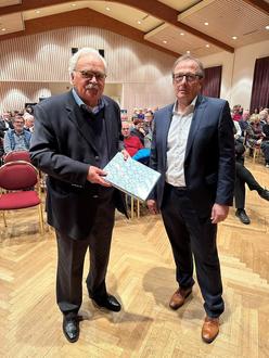 Joachim Plitzko (rechts), 1. Beigeordneter VG Mendig, bedankte sich bei Adolf Winkler und überreichte dem Filmemacher ein Gastgeschenk.