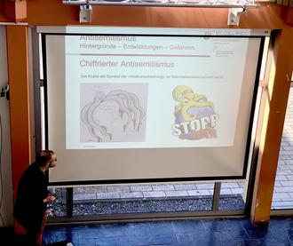 Zu diesem Zweck hatte der Fachkonferenzleiter Sozialkunde, Herr Achim Engels, einen Mitarbeiter des rheinland-pfälzischen Verfassungsschutzes, Herrn Andreas Groth, an das Megina-Gymnasium eingeladen. Herr Groth referierte zunächst äußerst kompetent zu dem leider sehr aktuellen Thema „Antisemitismus“, indem er einen historischen Abriss des Themas vortrug. Dabei wurde deutlich, dass es sich beim Antisemitismus um ein sehr altes Problem handelt, welches bereits in der Antike vorzufinden war. Auch im Mittelalter war Antisemitismus weit verbreitet, wobei etliche der damals schon verbreiteten Stereotype bis heute nachwirken.