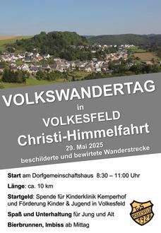 Der Vorstand des TuS Volkesfeld freut sich darauf, am 29. Mai wieder den traditionellen Volkswandertag auszurichten zu dürfen. Hierzu können alle Interessierten zwischen 08:30 Uhr und 11:00 Uhr vom Dorfgemeinschaftshaus aus starten. Für die Versorgung während und nach der Wanderung wird gesorgt sein. Einem fröhlichen Vatertag im Freien dürfte somit nichts mehr im Wege stehen.