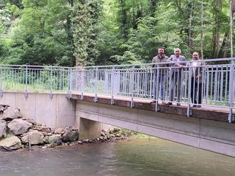 Die neue Geländerhöhe entspricht nunmehr auch den Sicherheitsvorgaben für die Nutzung durch Radfahrer. Bei einem gemeinsamen Ortstermin überzeugten sich Bürgermeister Alfred Schomisch mit seinem zuständigen verantwortlich zeichnenden Mitarbeiter Dominik Dröschel und Bürgermeister Bernhard Mauel von der gelungenen Wiederherstellung der Rohrbrücke.