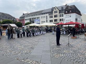 In Begleitung der Schützenkapellen aus Luxem und Mendig, des Spielmannszuges der Freiwilligen Feuerwehr Kruft sowie der Blaskapelle Weibern versammeln sich die Mayener Schützen zu Ehren von Oberbürgermeister Dirk Meid und Landrat Marco Boos. Diese Tradition des Schützenständchens geht zurück auf die Zeit, als Mayen noch Amtssitz der Kreis- und Stadtverwaltung war. Auch nach der Gebietsreform wurde sie mit viel Herzblut weitergeführt - ein lebendiges Zeichen für die Bedeutung von Heimat, Gemeinschaft und Geschichte.