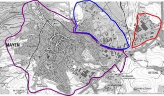 Abrechnungseinheit (AE) 7 - Mayen Stadtkern (lila), AE 8 - Mayen GE Mayener Tal (rot) und AE 9 - Mayen GE Nord (blau)