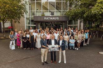 Der Personalratsvorsitzende Florian Rieser (links) und der Büroleiter Fabian Schneider (rechts) übergaben Jörg Lempertz zur Ernennung als Bürgermeister der VG Mendig ein Foto mit den Mitarbeiterinnen und Mitarbeitern der Verwaltung.