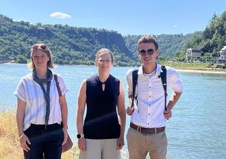 Stephanie Dirks (links), wissenschaftliche Mitarbeiterin des Projektbüros Mühlsteinrevier RheinEifel, Nadya König-Lehrmann, Geschäftsführerin des Zweckverbands „Welterbe Oberes Mittelrheintal“, sowie Projektleiter Dr. des. Nicolas Junglas vor dem berühmten Loreleyfelsen.