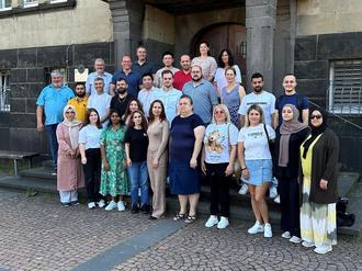 Die Teilnehmer des Allgemeinen Integrationskurses in Mendig mit ihrem Dozenten Max Kaiser (2. Reihe: 4.v.r) wurden vom künftigen Stadtbürgermeister Achim Grün (2. Reihe: links), Stadtbürgermeister Hans Peter Ammel (3. Reihe: links) und VG-Bürgermeister Jörg Lempertz (3. Reihe: 2. v. l.)), sowie den Vertretern der „Komm-Aktiv“ (von links): Geschäftsführer Werner Schneider, Prokuristin Eva Eisbach und der Verwaltungskraft der Integrationskurse Susanne Weiner, begrüßt.
