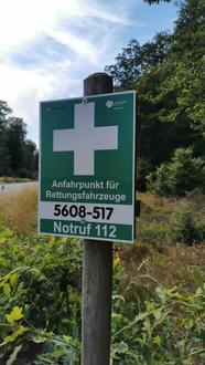 Im Hinblick auf die Örtlichkeit können die Rettungspunkte im Wald (der Rettungskette Forst) - grünes Schild mit weißem Kreuz und zwei Nummern - zur schnellen Auffindung des Gefahrenpunktes eine wertvolle Hilfe sein. Sie befinden sich gut sichtbar an wichtigen Punkten im und am Waldrand die zunächst gut erreichbar sind.