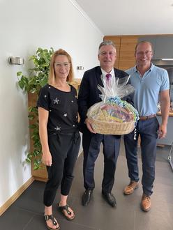 Caroline Hamann, Gleichstellungsbeauftragte der Verbandsgemeinde Mendig, Jörg Schwammkrug„ Geschäftsführer C’est Madame“ Bad Neuenahr und Jörg Lempertz, Bürgermeister der Verbandsgemeinde Mendig (v.l.n.r.) bei der Danksagung und Überreichung eines Geschenkkorbes für die Helfer.