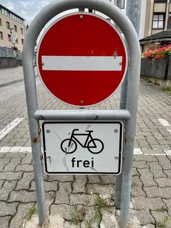 Die für Radfahrer aufgehobene Einbahnstraßenregelung ist durch entsprechende Beschilderung gekennzeichnet