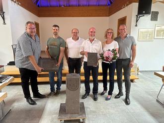 Abschiedsgeschenke und das Wappenschild der Ortsgemeinde (von links): Thomas Schmitt, Julian Rech, Rudolf Schüller, Rudolf und Claudia Wingender und Jörg Lempertz.