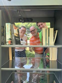 „Westenergie“-Regionalmanager Fabian Vocktmann (rechts) eröffnete die neue Tauschbörse gemeinsam mit Ortsbürgermeister Andreas Doll und der Bücherpatin Esther Rausch.