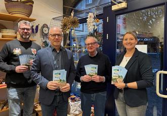 V.l.n.r.: Oliver Schick (Steuerungsgruppe Fairtrade), Oberbürgermeister Dirk Meid, Harald Viehmann (Steuerungsgruppe Fairtrade) und Fairtrade Beauftragte Janine Pitzen freuen sich für die erste Auflage des Einkaufsführers