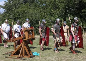 Mit weiteren historisch und archäologisch Begeisterten ahmte die Römergruppe Legio XXII Primigenia Pia Fidelis Cohors I. die Zeit aus dem ersten Jahrhundert nach Christus nach. Die Legio XXII Primigena war eine echte Legion der römischen Armee in Mainz. Sie war wahrscheinlich 39 nach Christus in Mainz aufgestellt worden. Jede volle Stunde ließ der Hauptmann der Hundertschaft auf dem weitläufigen Gelände seine Männer mit kräftigen respekteinflößenden Kommandos in der sengenden Hitze antreten.