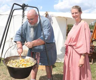 Wochenende auf dem Areal der Erlebnisweiten am Mayener Grubenfeld seine Zelte aufgeschlagen und die bewundernden Blicke der Besucher magisch angezogen. „Wir sind aktuell noch auf der Suche nach Jungfrauen“, erklärte der Angehörige der römischen Armee mit einem vielversprechenden Lächeln im Gesicht, während es unweit, aus einem Kessel nach frischer Gemüsesuppe mit Fleischstücken duftete. Diese köchelte über einem Holzfeuer und musste lediglich ab und an kräftig ungerührt werden. „Wir tragen heute Nachmittag unseren leichten Dienstanzug, unsere Sommermontur“, entschuldigte sich Titus Flavius Verius, der von Beginn an das Mayener Römerfest mit seinen Mannen bereichert. Der Offizier ließ es sich nicht nehmen, sich voller Stolz trotz Temperaturen um die 30 Grad mit einem schweren, mit Federn verzierten Helm und einen mit Messingplatten verzierten Militärgürtel, der er über seiner Dienstuniform trug, zu präsentieren. Die Messingplatten waren an mehreren langen Lederstreifen angebracht und dienten im Kampf als Schutz gegen eine Entmannung. Das sogenannte Cingulum militare galt vor 2000 Jahren als ein Erkennungsbild der Soldaten schlechthin und war insbesondere bei den jungen Frau sehr beliebt. Normalerweise hätten die Mitglieder der Legio XXII ihre 35 Kilogramm schwere Kampfausrüstung – das Gewicht der kompletten Marschausrüstung ist noch mal um satte dreizehn Kilogramm höher – getragen.