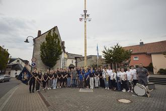 Die Kirmes-Vereine vor den neuen Wappen am Kirmesbaum