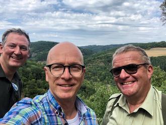 Von links nach rechts: Eckart von Hirschhausen, Oberbürgermeister Dirk Meid und Peter Göke erkunden den Mayener Stadtwald