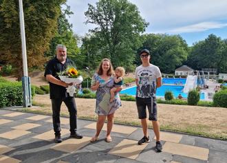 Nur 10 Tage nach der Gratulation für die 15.000 Besucherin, konnte der Erste Beigeordnete der Stadt Mendig Achim Grün, am Montag, 25.07.2022, schon die 20.000ste Besucherin und ihre Begleitung, im Vulkanbad willkommen heißen.