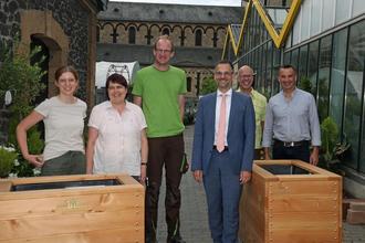 von links nach rechts: Lena Selbach, Personalreferentin des Klosters Maria Laach, Katrin Batsche, Andreas Seif, Philipp Lohse, der Kaufmännische Leiter des Klosters, Guido Moog (Integrationsassistent) und Einrichtungsleiter Christoph Hüging freuen sich über die gute Zusammenarbeit. Die auf dem Foto im Vordergrund zu sehenden Hochbeete werden der Caritas Werkstätten im Landkreis Mayen-Koblenz hergestellt.
