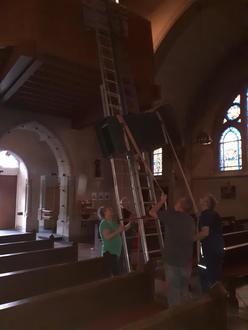 Da der bisherige Raum in der alten Schule zu räumen war, musste ein neuer Platz zur Lagerung der Noten gefunden werden. Die Wahl fiel auf den Orgelboden der Beller Pfarrkirche.Schnell waren die Schränke für den Transport zur Kirche verladen. Dort folgte dann der abenteuerliche Teil: Unter fachkundiger Anleitung des Chorleiters Claus Heuft „schwebten“ die Notenschränke gut gesichert aus dem Mittelschiff der Kirche gen Orgelboden, wo sie von tatkräftigen Männern sicher in Empfang genommen und an Ort und Stelle wieder aufgebaut wurden.