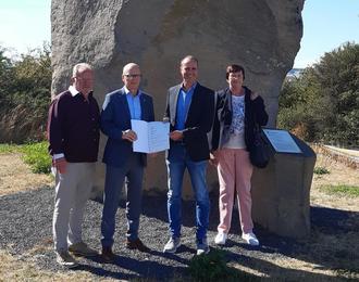 Clemens Hoch (2. v. r.) übergibt den symbolischen Bescheid über die Zusage der Landeszuweisung an Oberbürgermeister Dirk Meid (2. v. l.). Mit ihm freuen sich Klara Nolden (rechts), stellvertretende Ortsvorsteherin von Alzheim, und ihr Kollege aus Hausen, Ortsvorsteher Karl Josef Weber (links)
