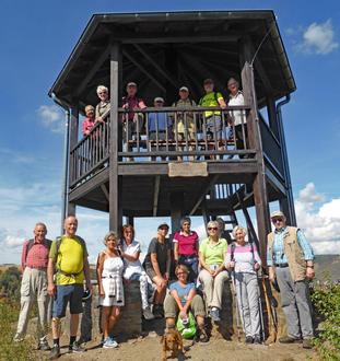 Die Wandergruppe auf dem Aussichtsturm "Mönch-Felix-Hütte" bei Niederfell