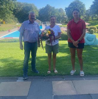 Elisabeth Jäger aus Mendig freute sich sehr über diesen besonderen Empfang und den tollen Blumenstrauß. Sie nutzte gerne die Gelegenheit das Mendiger Freibad und seine Mitarbeiter zu loben. Mit der tollen Lage und den gepflegten Grünanlagen bot das Mendiger Vulkanbad auch in diesem Jahr wieder beste Bedingungen für einen schönen und erfrischenden Tag.