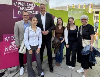 Ingelheim. Am 20. Demokratietag Rheinland-Pfalz, der 2025 sein 20-jähriges Jubiläum feierte, war auch die Albert-Schweitzer Realschule plus Mayen vertreten. Gemeinsam mit den Lehrkräften Manuela Berck und Nicolas Cordes nahmen drei Schülerinnen an der Veranstaltung teil und erlebten einen Tag ganz im Zeichen der Demokratie.