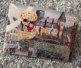 Sammler aufgepasst: Der diesjährige Lukasmarkt-Pin ist bereits verfügbar! Das Motiv wechselt jährlich und zeigt in diesem Jahr Mayener Mädche und Jung bei einer aussichtsreichen Fahrt auf dem Riesenrad. Das Hintergrundbild (in Privatbesitz) stammt vom Mayener Künstler Richard Frensch und wurde auf Bitte des Marktamtes von Gisela Irmtrud Keiffenheim um Lukasmarkt-typische Elemente ergänzt. Frenschs Kunstwerke zierten bereits die Pins in den Jahren 2017, 2018, 2022 und 2023. Der Pin 2024 soll eine Hommage an den in diesem Jahr verstorbenen Künstler darstellen.