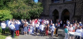 MENDIG. Bei nahezu hochsommerlichem Wetter traf sich Alt und Jung am 17.09.2023 auf dem Vorplatz der Cyriakus Kirche zu einem fröhlichen Beisammensein. Auf Einladung der Stadt und der Pfarrgemeinde fanden sich neben den Besuchern des Kirmes-Gottesdienstes, den die Singgemeinschaft Schlich musikalisch gestaltet hatte, auch eine große Gruppe Kinder ein, die vorher einen Erntedank-Kindergottesdienst im Pfarrheim besucht hatten.