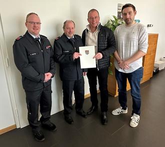 Dank und Anerkennung für den jahrzehntelangen ehrenamtlichen Einsatz von Gerd Schüller (2. v. l.). Es gratulierten (von links) Christopher Wittig, Wehrführer Freiwillige Feuerwehr Mendig, Jörg Lempertz, Bürgermeister VG Mendig, und Florian Rieser, Feuerwehr-Sachbearbeiter VG-Verwaltung Mendig.