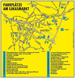 Weiterhin empfiehlt die Stadtverwaltung Mayen auch die Parkflächen außerhalb der Innenstadt zu nutzen, etwa im Bereich des Katzenbergerwegs und der Hausener Straße. Von hier aus erreicht man das Marktgelände entweder fußläufig in ca. 20 Minuten oder man nutzt ganz bequem die öffentlichen Verkehrsmittel um in die Innenstadt zu gelangen.
