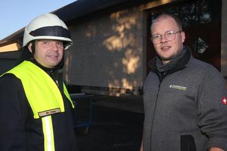 Auch Ortsbürgermeister Stefan Zepp war als Feuerwehrmann mit im Einsatz. Das Foto zeigt ihn (links) mit Marvin Rawert, den Besitzer der Holzmanufaktur.