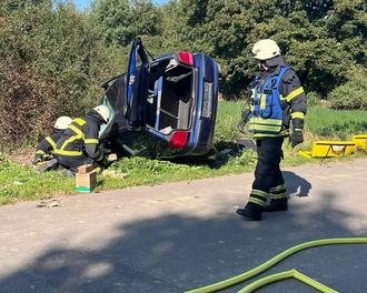 Feuerwehrleute üben die Rettung von Verletzten nach einem simulierten Verkehrsunfall